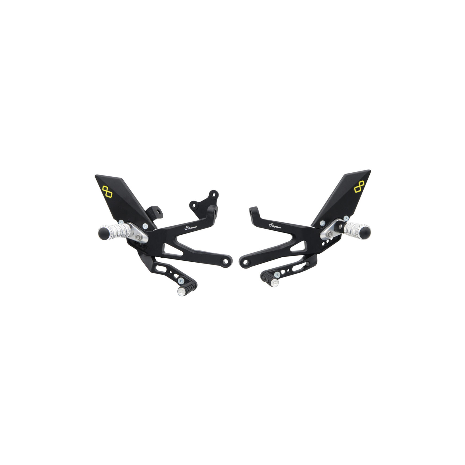 Lightech's rearsets are made of Ergal 7075-T6 machined from solid. The main support is made of a single block, resulting in a more resistant structure and exceptional rigidity that transmits a greater driving feeling to the rider. They are adjustable in height and backwards, offering multiple footpeg positions, which can be implemented with the aid of optional footpeg holders. Up to 3 high-quality bearings are integrated into the levers to withstand the most extreme stresses on the road, but especially on the track. The rearsets can be customized thanks to a wide range of accessories and spare parts. The ""standard"" rearset is equipped with fixed silver footpegs and fixed toe-pegs and silver footpeg supports. If necessary, it is possible to purchase each individual component of the rearset itself. These rearsetes are compatible with the optional UP& DOWN support, code RFTR244.